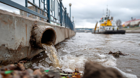 The image depicts a drain pipe discharging polluted water into a river, highlighting environmental concerns and urban challenges. A tugboat navigates the water under a cloudy sky.