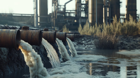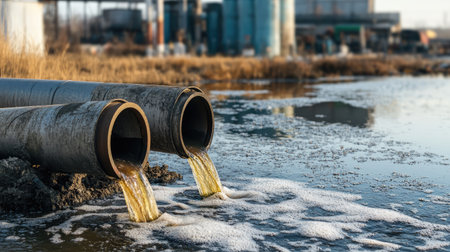 Close-up of pipes discharging toxic sludge into a river, with industrial plant structures behind