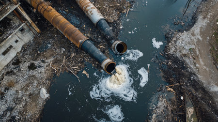 Close-up of waste flowing from industrial pipes into a natural stream, highlighting environmental pollution