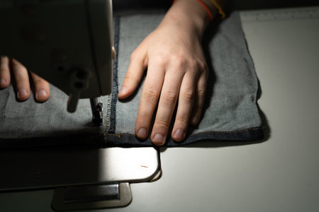 Hands of a young girl in a sewing workshop. Sewing on a zipper on a sewing machine. Sewing concept.