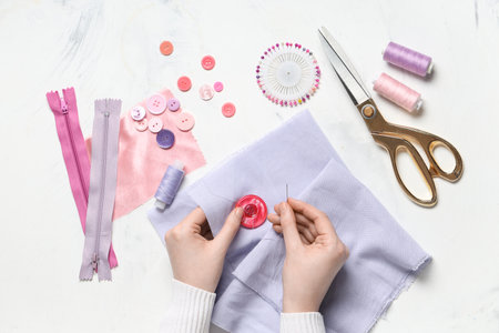 Female hands with different colorful buttons, sewing supplies and fabric on white background