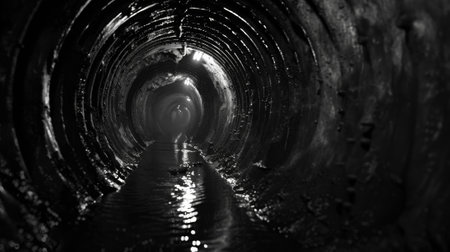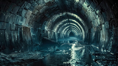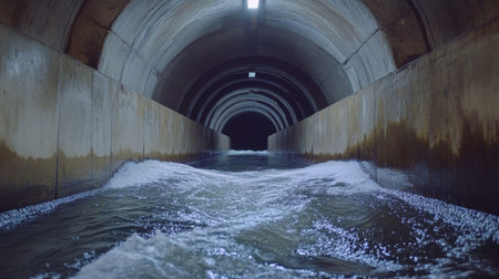 This captivating image features a dark underground water tunnel, showcasing flowing water against smooth concrete walls. Soft light creates an intriguing atmosphere.