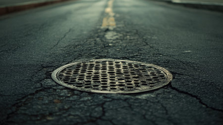 A close-up shot of a round manhole cover set in a cracked asphalt road, showcasing urban infrastructure and the texture of weathered pavement.