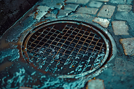 A close up of a manhole cover with water on it, AI