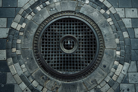 a Photo of a manhole cover made of steel In modern vintage style