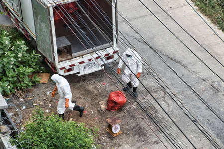 Bangkok, Thailand 03.26.2021 Waste management employees in personal protective equipment collecting the waste from The Cotai Luxury Design Alternative State Quarantine hotel