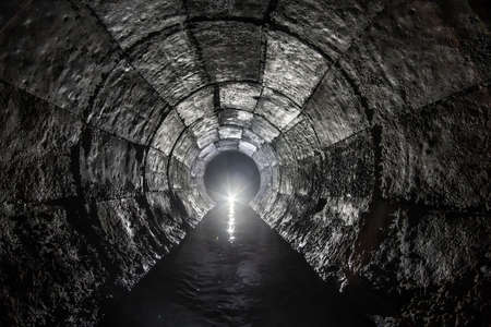 Round drainage concrete tunnel with water built with formwork. With light at the end. Underground river hidden in tube.