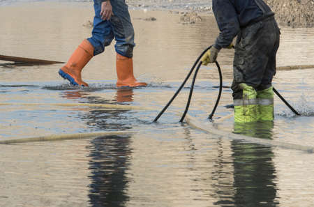 Process of cleaning up sewage collector. Pumping out household septic tank.
