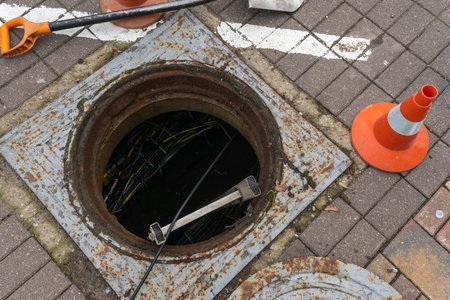 Open manhole with safety cones on pavement. Urban maintenance site with open manhole ladder and shovel surrounded by traffic cones. Infrastructure inspection in progress with tools and safety markers.