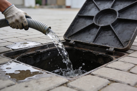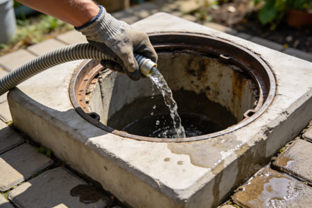 A person in protective gloves is using a flexible hose to pour water into an open concrete septic tank, with water splashing into the dark liquid below