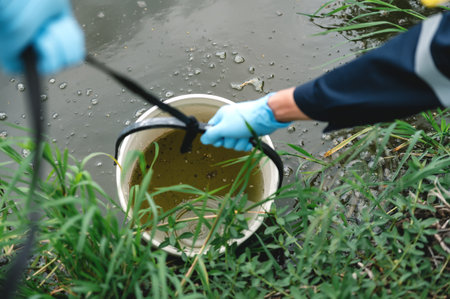 Environmental Engineers Take Water Samples at Rotten Smelly Pond Water Sources, May Be Contaminated by Toxic Waste or Suspicious Pollution Sites.