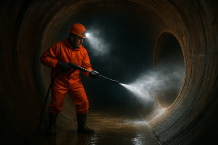 Worker conducting sewer cleaning operation with high-pressure water nozzle in underground tunnel. concept of maintenance safety, urban infrastructure, industrial work.