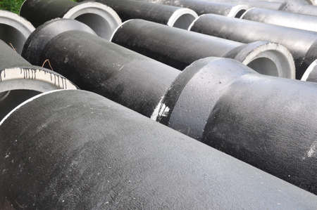 concrete pipes coated with protective mastic at a construction site. Stock