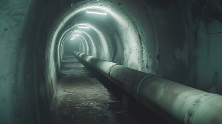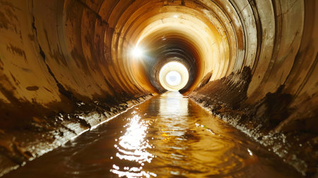Moody Industrial Atmosphere in a Spacious Underground Sewer Tunnel with Dim Lighting. Concept of Urban Infrastructure, Engineering, Industrial Design, and Underground Exploration.
