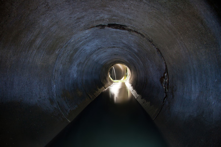 The tunnel cement pipe has black shadow and light at the end of the tunnel.