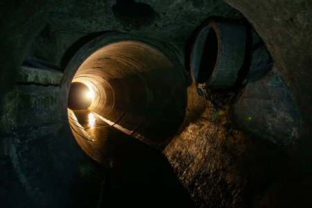 Toxic water running from sewers in dirty underground sewer for dredging drain tunnel cleaning.