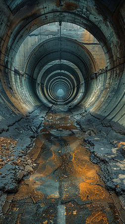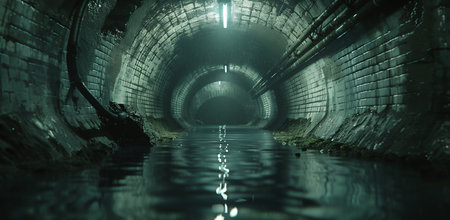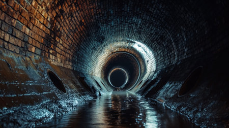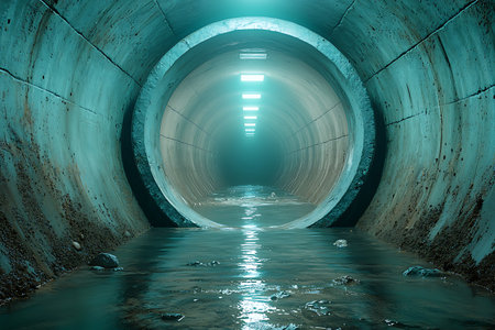 This captivating image features a dark underground water tunnel, showcasing flowing water against smooth concrete walls. Soft light creates an intriguing atmosphere.