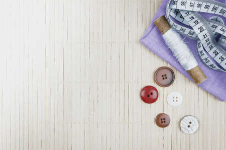 tailor the tool to measure the length, scissors, spools of colored thread on a wooden background