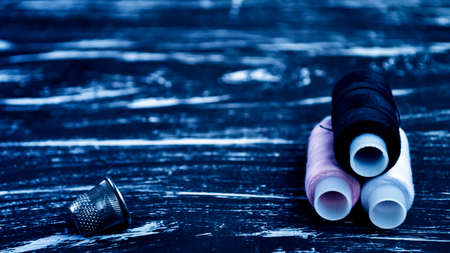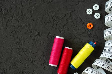 Top view of sewing supplies, sewing threads on dark background with copy space