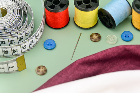 Sewing accessories and fabric on a green background. Including needle, thread, buttons and measuring tape.