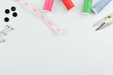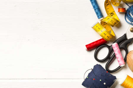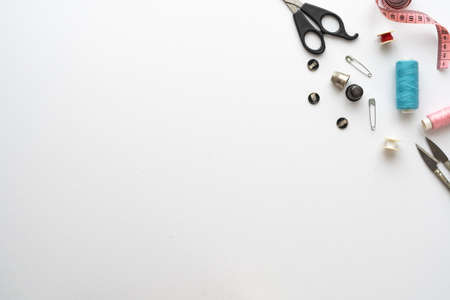 Sewing items from above. Flat lay composition with sewing accessories on light color background. Items for sewing, Sewing clothes, measuring tape, tailoring scissors, threads, buttons and needles