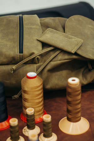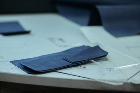 Close-up photo the hands of a skilled shoemaker make a bag from a piece of genuine leather.