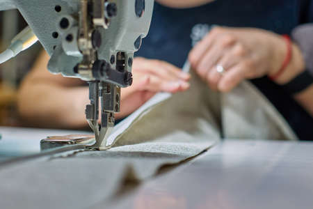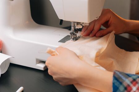Process of a seamstress sewing beige fabric in a sewing workshop. The needle of the sewing machine is in motion. The process of sewing fabric.