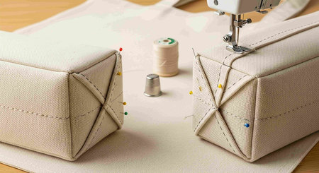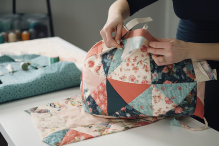 person, sewing and creating a tote bag from fabric scraps, created with generative ai