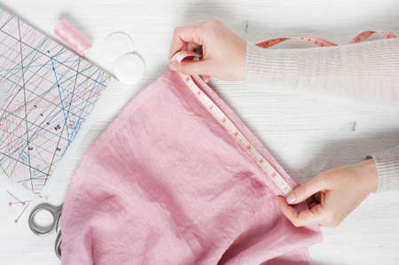 Top view Step by step, woman dressmaker female measuring sewing pattern On Table, Mature tailor working in atelier, textile industry, hobby, workspace. Creation process DIY, Workplace of seamstress.