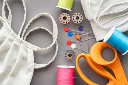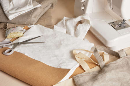 handmade eco shopping bag made of cotton fabric, sewing machine, scissors, glasses and spools of thread on the table, copy space, shopping with a reusable bag concept