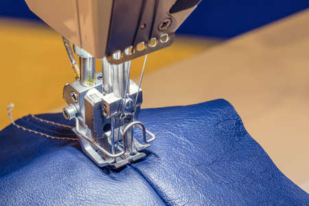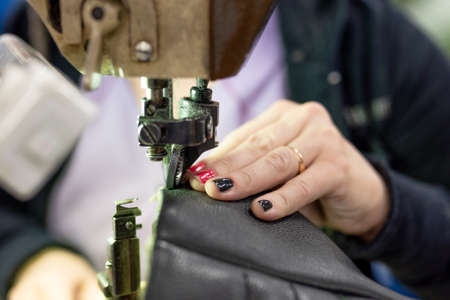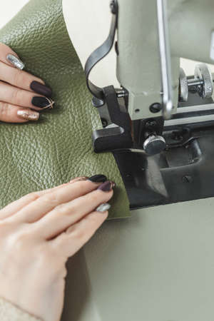Close up of sewing machine working part with leather. The masters hands sews a leather product. Handmade concept.
