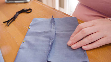 hands of an enterprising young woman while studying fashion design online, sewing a denim jean. sewing with electronic sewing machine from home
