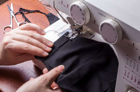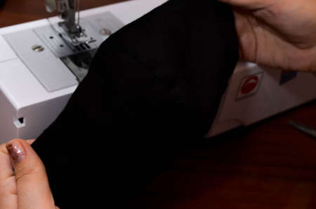 Making a medical black mask with your own hands at home. DIY protective mask. Black mask on a white background. Cotton mask