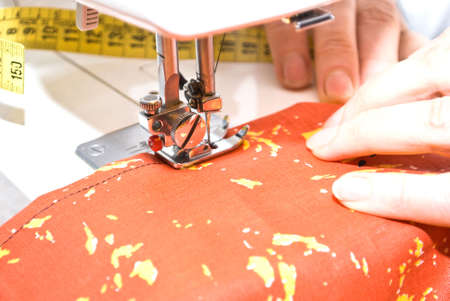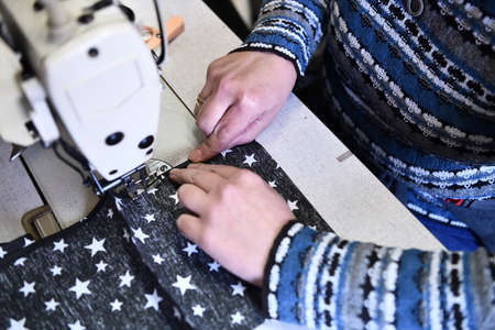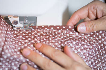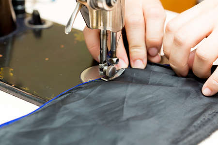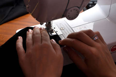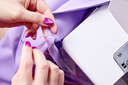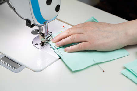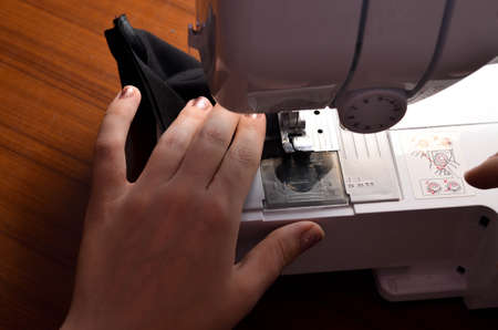 girl seamstress sew on the sewing machine. Womens hands sewing on the sewing machine