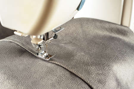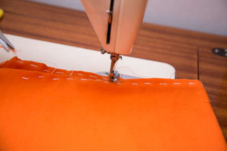 Close-up of the sewing machine needle guide makes an even seam with a thread on a brown cloth of genuine leather. The hands of the cobbler.
