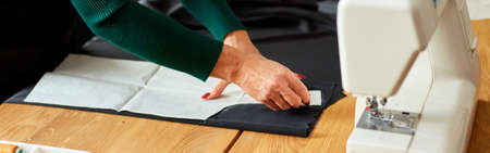 Banner Woman dressmaker female making sewing patterns, Mature tailor working with sewing pattern in atelier, textile industry, hobby, workspace. Creation process DIY, Workplace of seamstress.