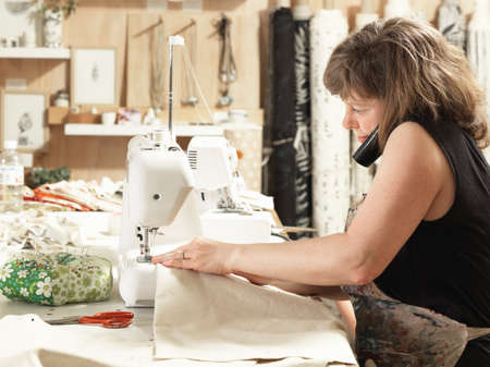 Cheerful woman sewing while sitting at her working place in fashion workshop