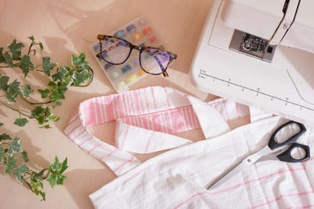 Fabric face mask and mask sewing supplies flat lay arrangement