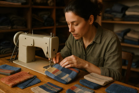 Focused seamstress carefully creating handmade colorful bags with a sewing machine, surrounded by fabric and finished products in her cozy workshop
