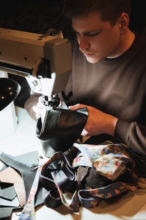 Sitting at a table in the workshop a young guy manually sews leather elements to each other