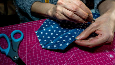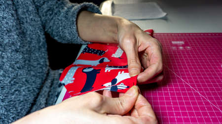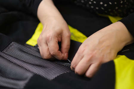 unrecognizable professional seamstress, hand tailoring, sews fabric by hand.