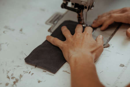 Close up of sewing machine working part with leather. The masters hands sews a leather product. Handmade concept.