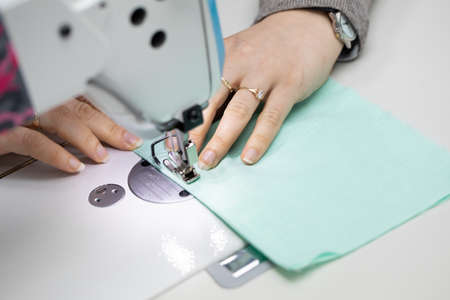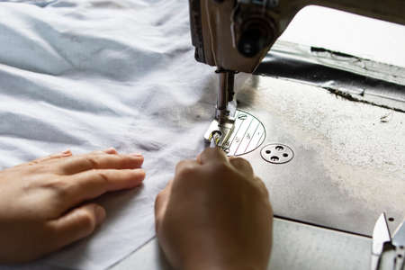 Hands of a dressmaker sewing clothes from white fabric on a sewing machine, close-up.