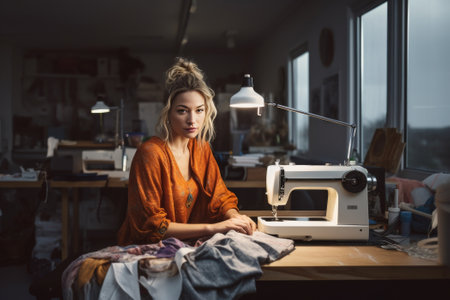 Cheerful woman sewing while sitting at her working place in fashion workshop