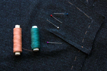 Top view of sewing supplies, sewing threads on dark background with copy space