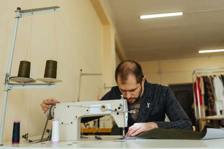 the master works on a sewing machine. thread the needle. seamstress. production. clothes. the cloth