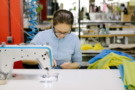 Clothing industry. Sewing machine. Atelier clothing. A woman works at the sewing machine. Tailoring. Training tailoring.