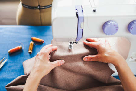The workplace of a seamstress. The dressmaker works on a sewing machine. A tailor threads a thread into a sewing machine at his workplace. Hobby-sewing as a small business concept. High quality photo