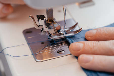 Handmade seamstress. Woman thin fingers hold the braid in a hand sewing machine close-up. Nearby lies a fabric with a blue pattern