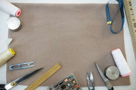 Tailor's tools on rag background with space for your text
